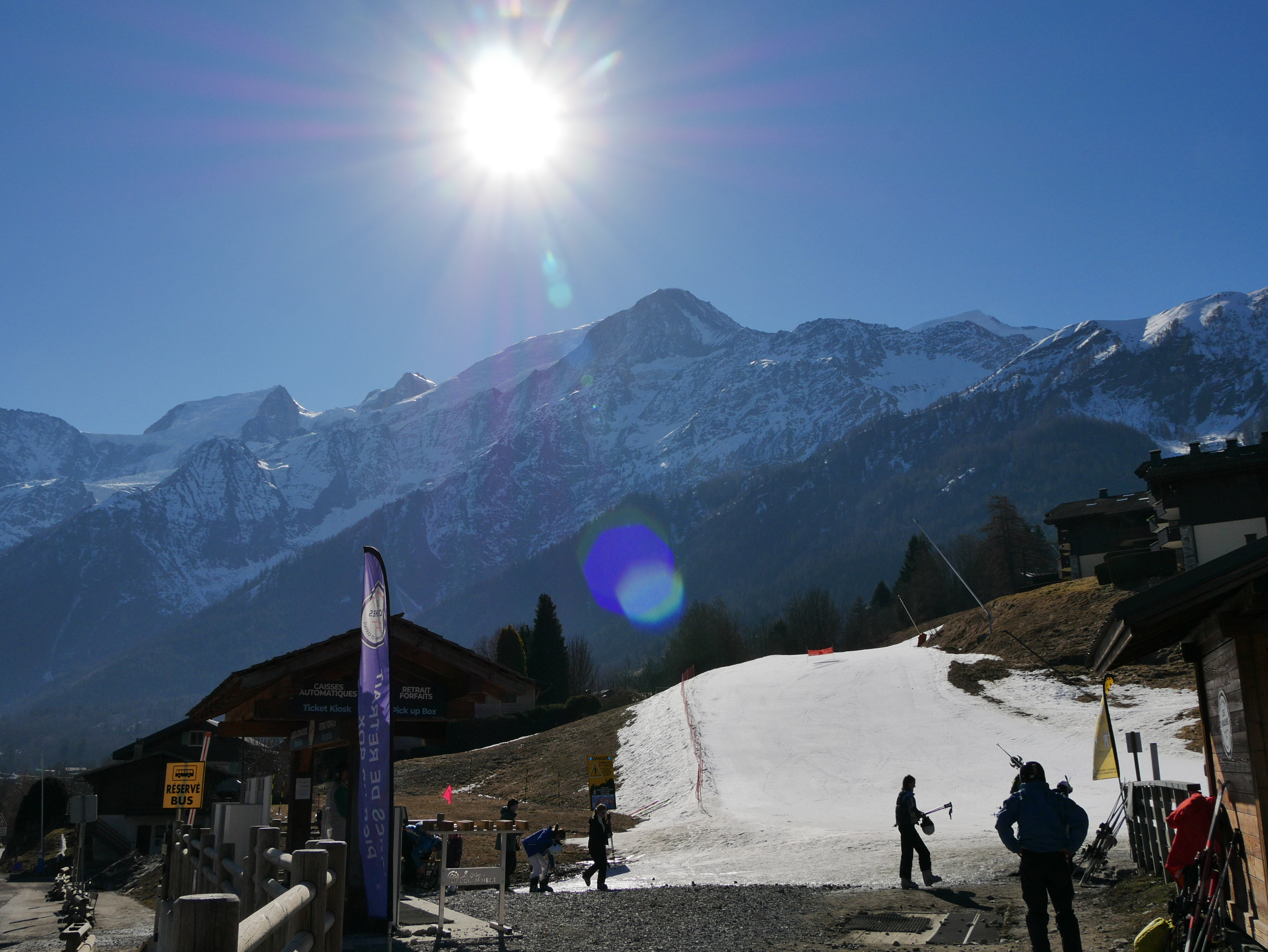 La montagne y est belle. Mais attention, on ne veut pas vous vendre de ticket piéton A/R si vous avez des chaussures de ski de randonnée aux pieds. Ils préfèrent voir des piétons en basket dans la neige à 1800m plutôt qu'avec un équipement adapté.