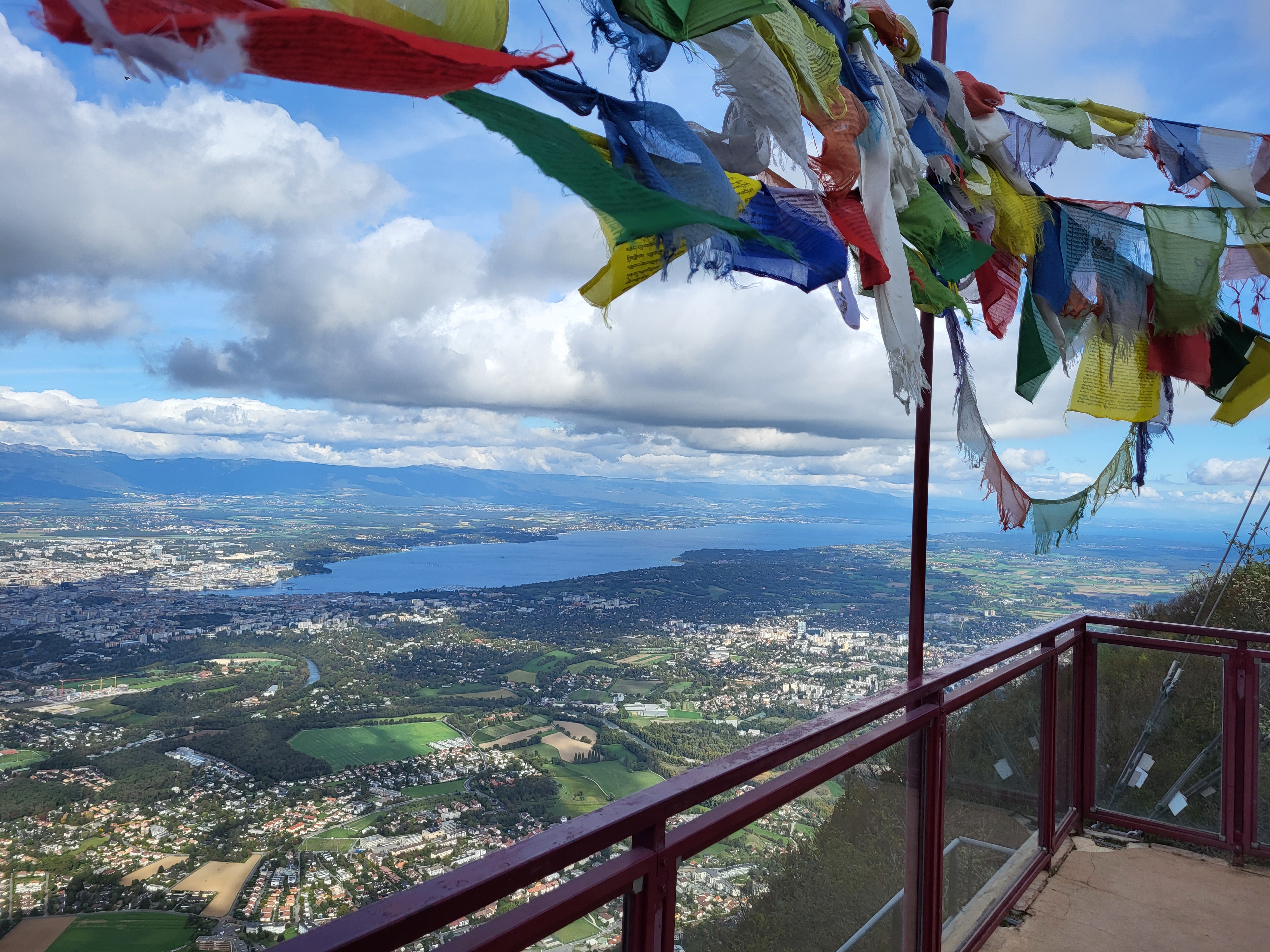 Génial ! Montée haute et très pentue on s élève dans les airs rapidement, impressionnant ! Énorme panorama sur Genève et son jet, et le lac et les alentours, après une petite marche on arrive à un temple boudistes entouré de fanions multicolores superbe !! À faire ! On pivote à 360 degrés et on se retrouve face au mont blanc ! Bol d air frais garanti !