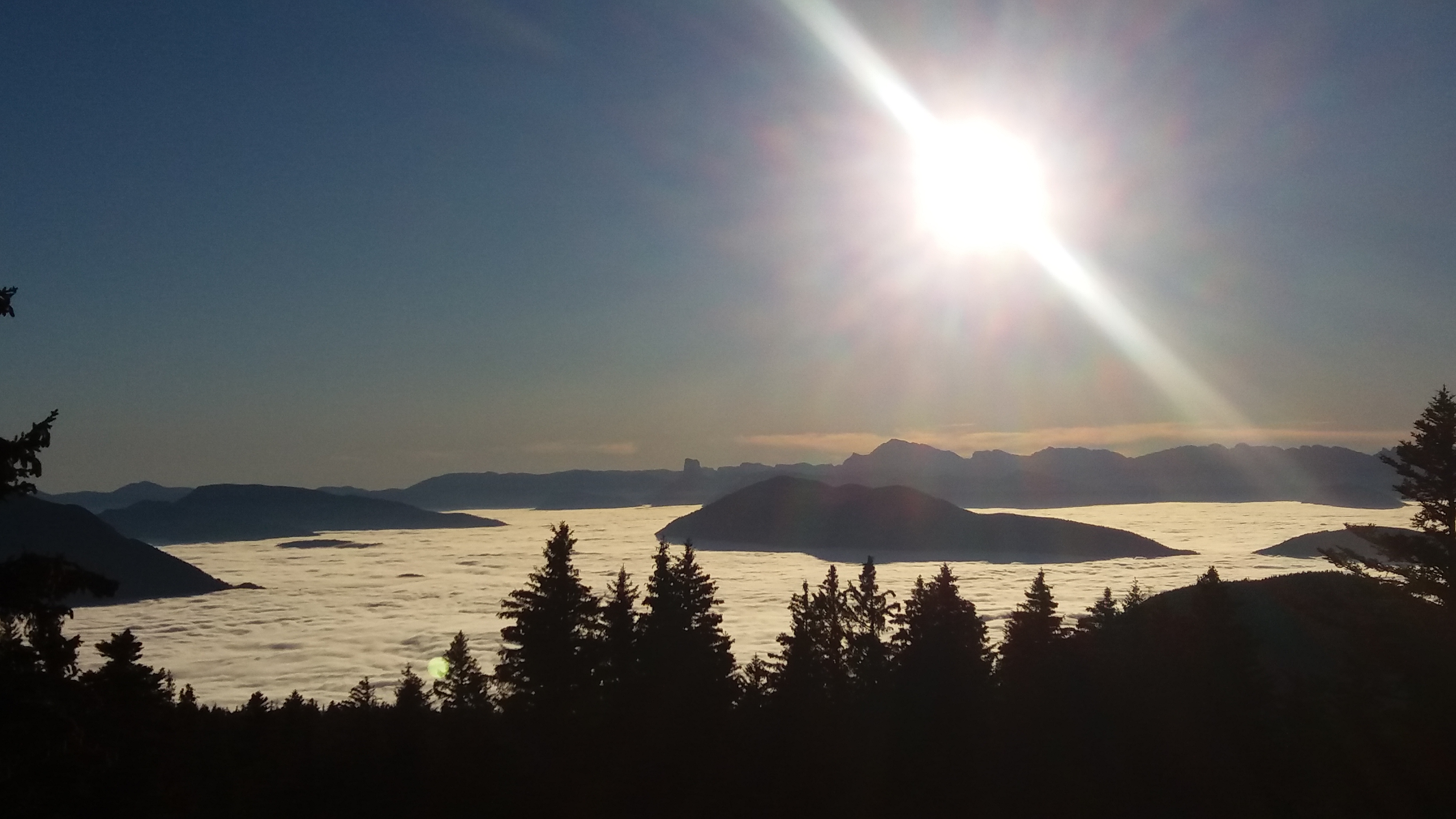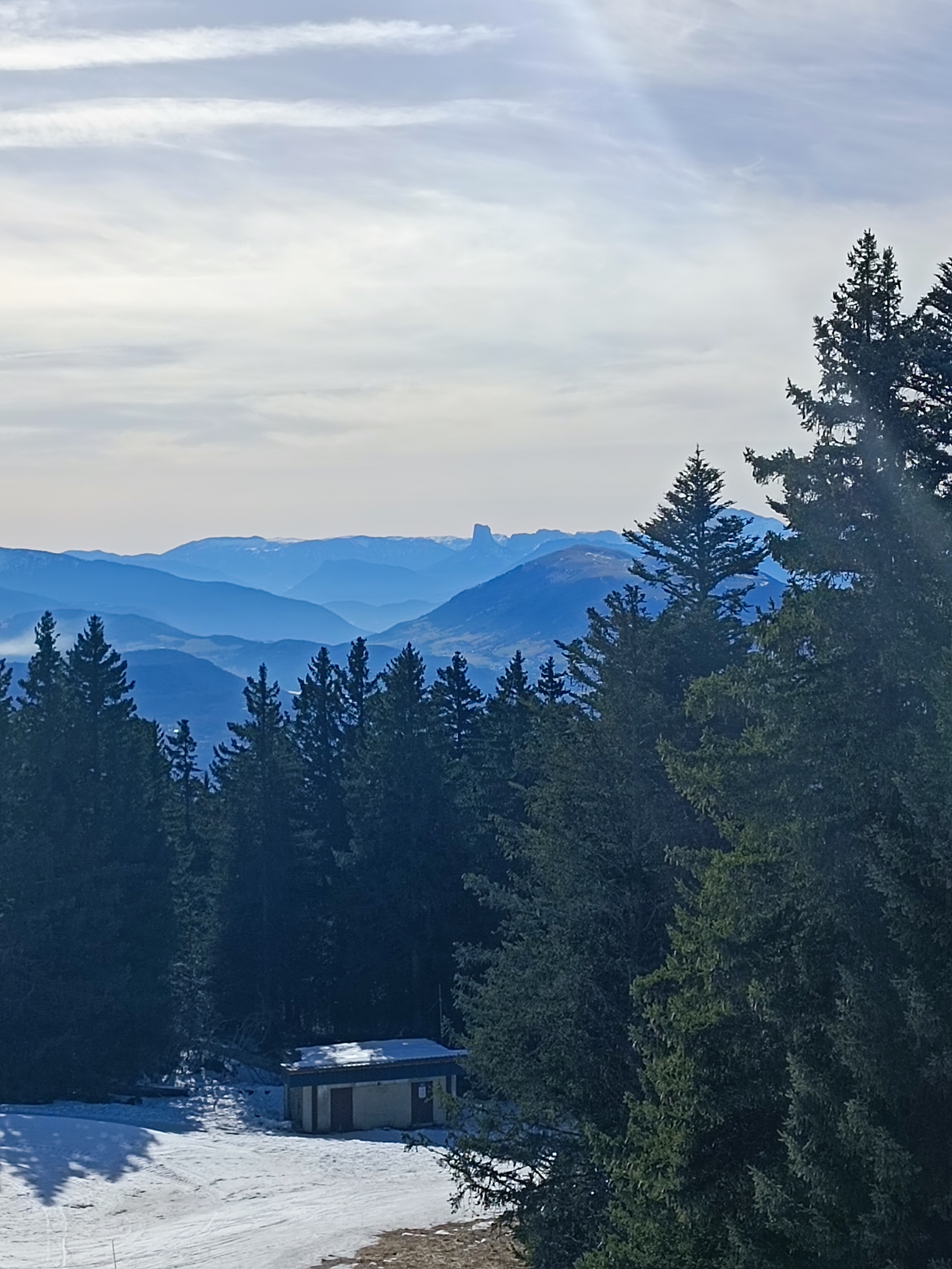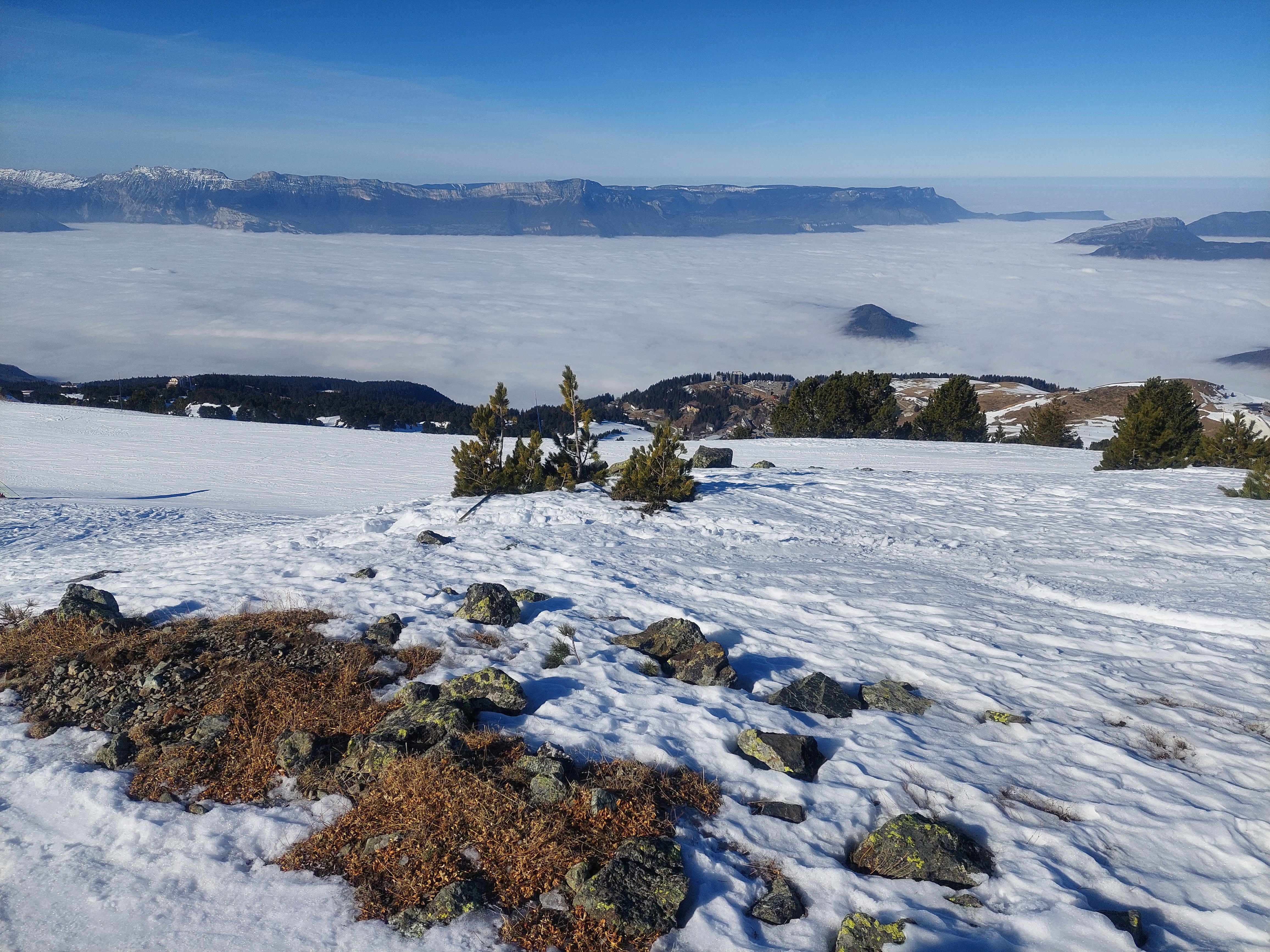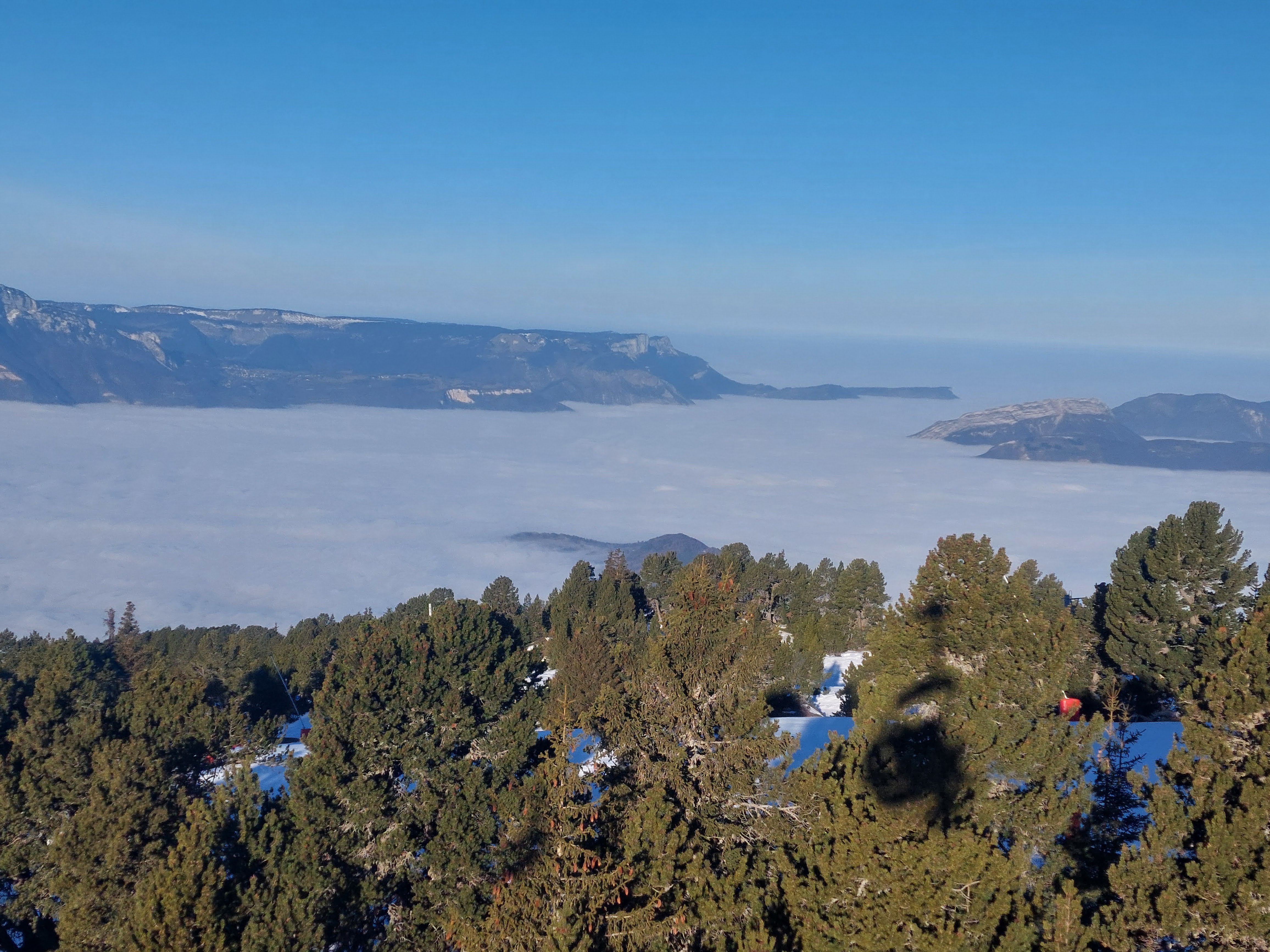 En cette date pas de télésiège en marche mais un point de vue extraordinaire sur la mer de nuages et au loin l'emblème du Trieves le Mont Aiguille majestueux